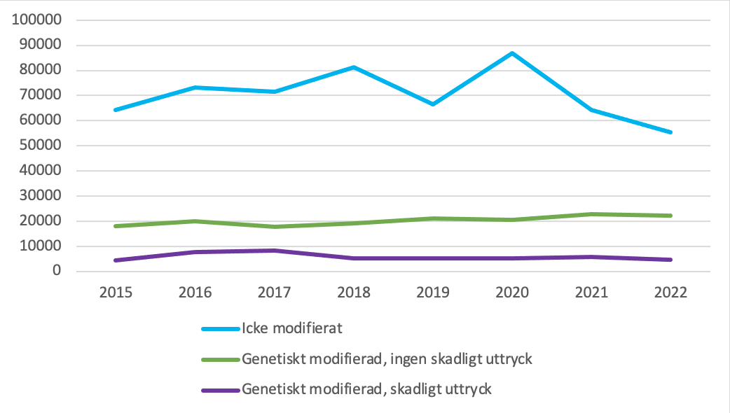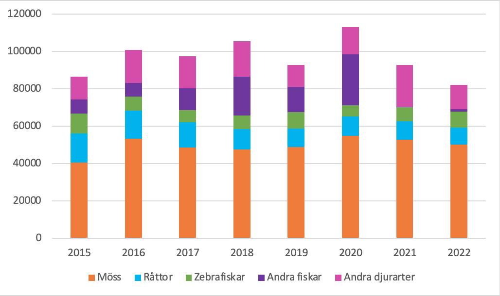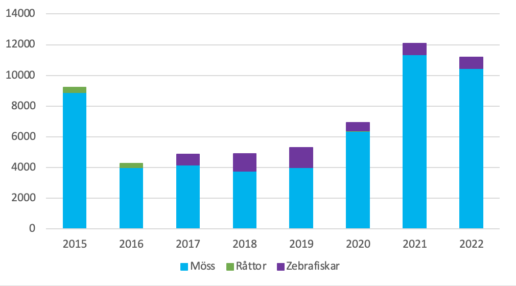 De försöksdjur som används i Finland är oftast möss (45–61 % av alla försöksdjur åren 2015–2022). Även råttor (9–18 %), zebrafiskar (5–12 %) och övriga fiskar (0,3–24 %) används mycket. Antalet djurförsök som genomförs i Finland har inte ändrats märkbart under de senaste åtta åren: åtgärder genomförs årligen på cirka 82 000–105 500 djur (figur 4). Dessutom utvecklas och upprätthålls genmodifierade försöksdjursstammar (ca 4 200–11200 individer i året; (figur 5).