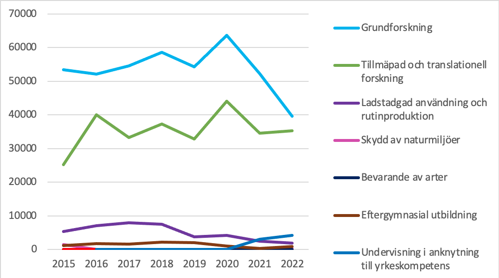 De djurförsök som görs i Finland anknyter huvudsakligen till grundforskning samt tillämpad och translationell forskning, genom vilken man strävar efter att öka kunskapen om sjukdomar och vården av dessa. Försöksdjur uppföds och används även för andra ändamål än forskning, exempelvis lagstadgad säkerhetstestning, produktion av antikroppar och upprätthållande av yrkeskompetens (figur 6).