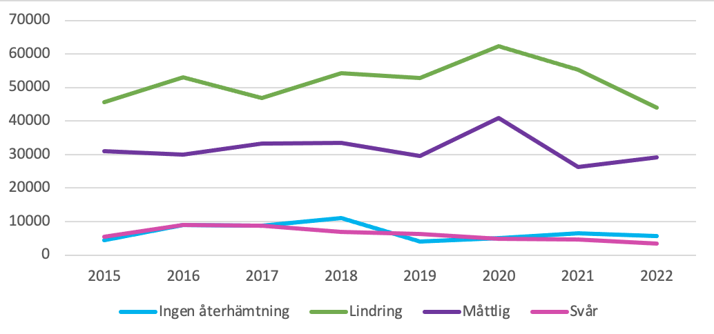 Djurförsöken klassificeras i fyra klasser enligt hur allvarligt lidande de förorsakar hos försöksdjuren. Utöver försök som ger upphov till lindrigt, måttligt och svårt lidande genomförs även försök där åtgärderna genomförs på nersövda djur och djuret avlivas i slutet av försöket, eller vävnader och andra nödvändiga prover samlas in från det avlivade djuret. Svårighetsgraden för dessa försök är ”ingen återhämtning”. Fördelningen över svårighetsgrader för de djurförsök som genomförs har inte ändrats märkbart under de senaste åtta åren. I allmänhet förorsakar åtgärderna lindrigt eller måttligt lidande för försöksdjuren. Minst genomförs försök i klasserna svårt lidande och ingen återhämtning. (figur 7)