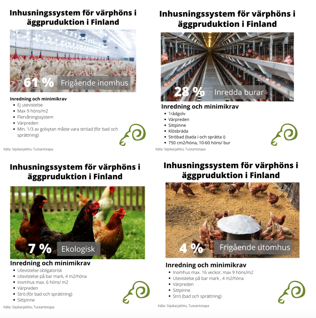 Hållningsförhållandena för värphönor har i snabb ordning ändrats från inredda burar till stallar för frigående höns inomhus. Redan nu produceras den största delen av äggen i stallar för frigående höns inomhus. Av de ägg som värptes i Finland år 2020 var över hälften från hönserier med inredda burar. År 2022 var endast 28 % av äggen av klass A från hönserier med inredda burar, medan den största delen, 61 %, producerades i stallar för frigående höns inomhus. Utomhushönseriernas (där utrymmena inomhus motsvarar vanliga stallar för frigående höns) andel av äggproduktionen år 2022 var enligt Fjäderfäförbundet 4 % och de ekologiska hönseriernas andel var 7 % (figur 10).