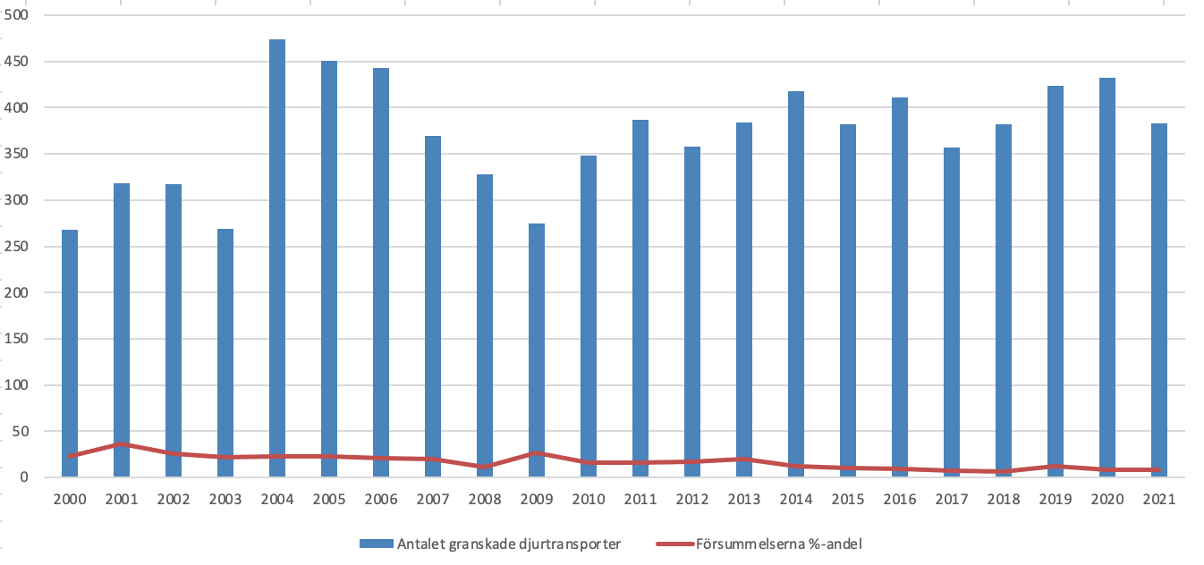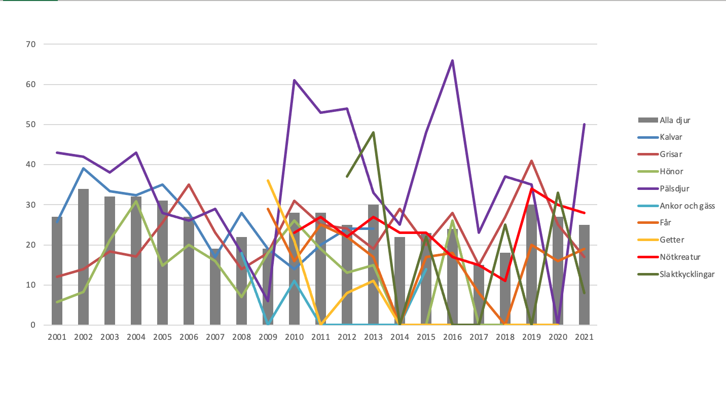 Tabell 1. Djurskyddsinspektioner på grund av misstanke 2010–2021 (källa: Livsmedelsverket)