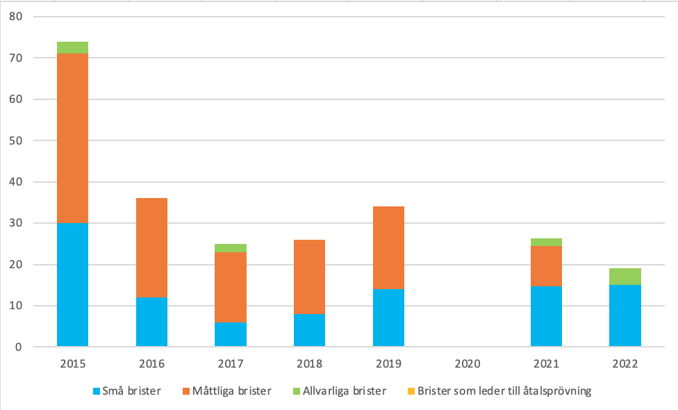 Enligt regionförvaltningsverket är minskningen av måttliga brister under de senaste åren en glädjande förändring som kan anses bero på den regelbundna tillsynen. År 2022 var 98 % av de inspekterade anläggningarna helt i skick eller behövde endast handledning i ringa grad (88 % år 2021). Minskningen av brister påverkar planeringen av den riskbaserade tillsynen så att inspektionsfrekvensen minskar, det vill säga färre aktörer och anläggningar behöver inspekteras årligen. Under coronaepidemiåret 2020 genomfördes endast en inspektion på en anläggning.
