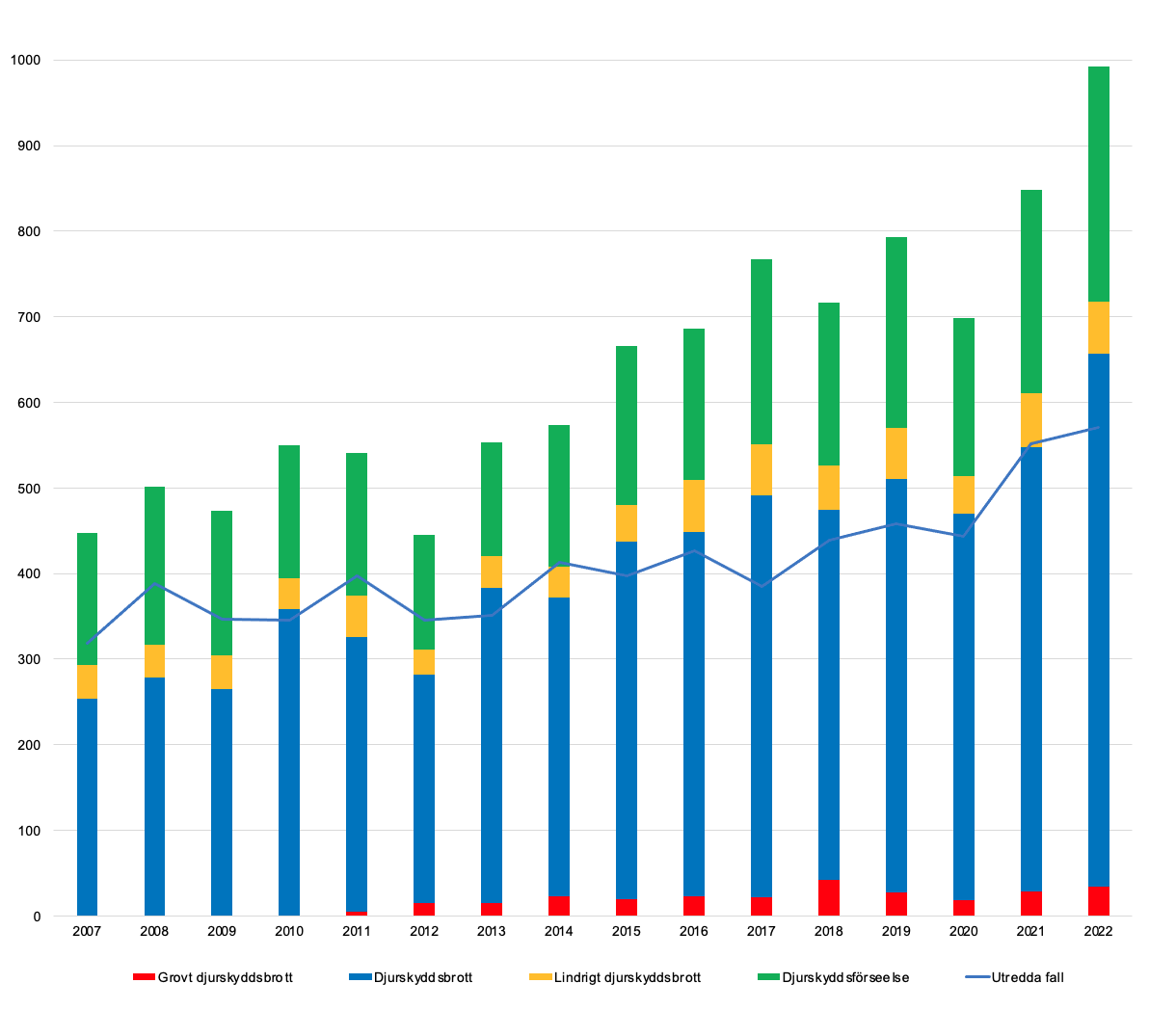 Sedan 2015 (Tabell 1.) har det årligen utförts över 6 000 djurskyddsinspektioner på grund av misstanke (tabell 1). Särskilt många djurskyddsinspektioner riktar sig mot sällskapsdjursobjekt, vilket beror på att kommunerna nu har fler tillsynsveterinärer och på att aktiva medborgare anmäler brister. En fjärdedel av inspektionerna har de senaste åren varit förnyade inspektioner. Antalet försummelser vid djurskyddsinspektioner på grund av misstanke har minskat en aning, men andelen allvarliga försummelser har ökat. Under de senaste åren har förbud eller order utfärdats vid inspektioner på grund av misstanke oftast inom animalieproduktionen, medan brådskande åtgärder för att trygga djurens välbefinnande oftast har avsett sällskapsdjurhållning.